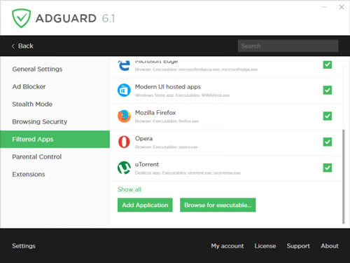 Nếu muốn thêm hay hủy quảng cáo xuất hiện trên ứng dụng, bạn hoàn toàn có thể thực hiện. Bấm Settings > Filtered Apps, bạn sẽ nhìn thấy danh sách các ứng dụng được chọn sẵn để chặn quảng cáo như Microsoft Edge, Chrome, ứng dụng Universal App,… Để thêm vào danh sách chặn quảng cáo cho ứng dụng nào đó, bấm Add Application > chọn trong danh sách hiện ra > Add Selected. Hoặc Browse for executablet để duyệt đến tập tin thực thi exe của ứng dụng đó. Ngược lại, muốn hủy bỏ chặn thì chỉ việc bỏ dấu chọn tại ứng dụng tương ứng.