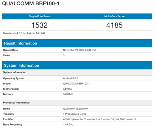 Điểm test trên mẫu BBF100-1 có chỉ số khá tốt, với Qualcomm Snapdragon 660 và 6GB RAM. Đây có thể là một sản phẩm BlackBerry Android tiếp theo mà TCL muốn mang đến cho người dùng. Sau sản phẩm KEYone khá thành công trên thị trường...
